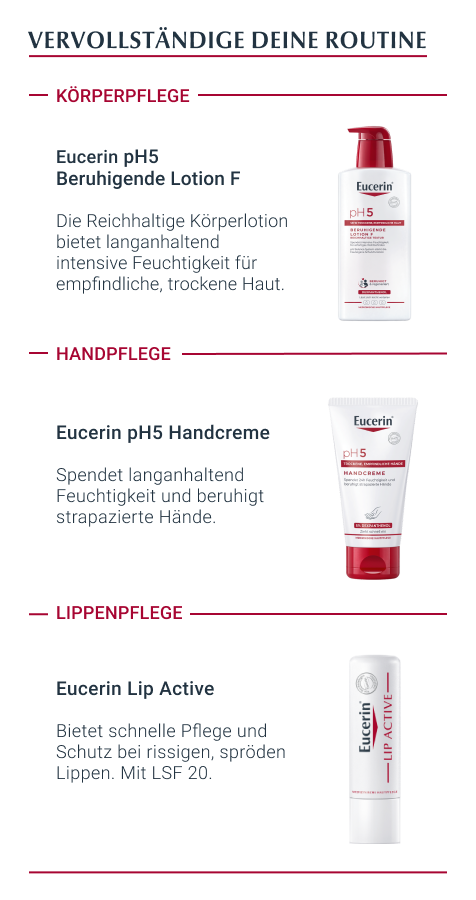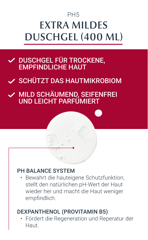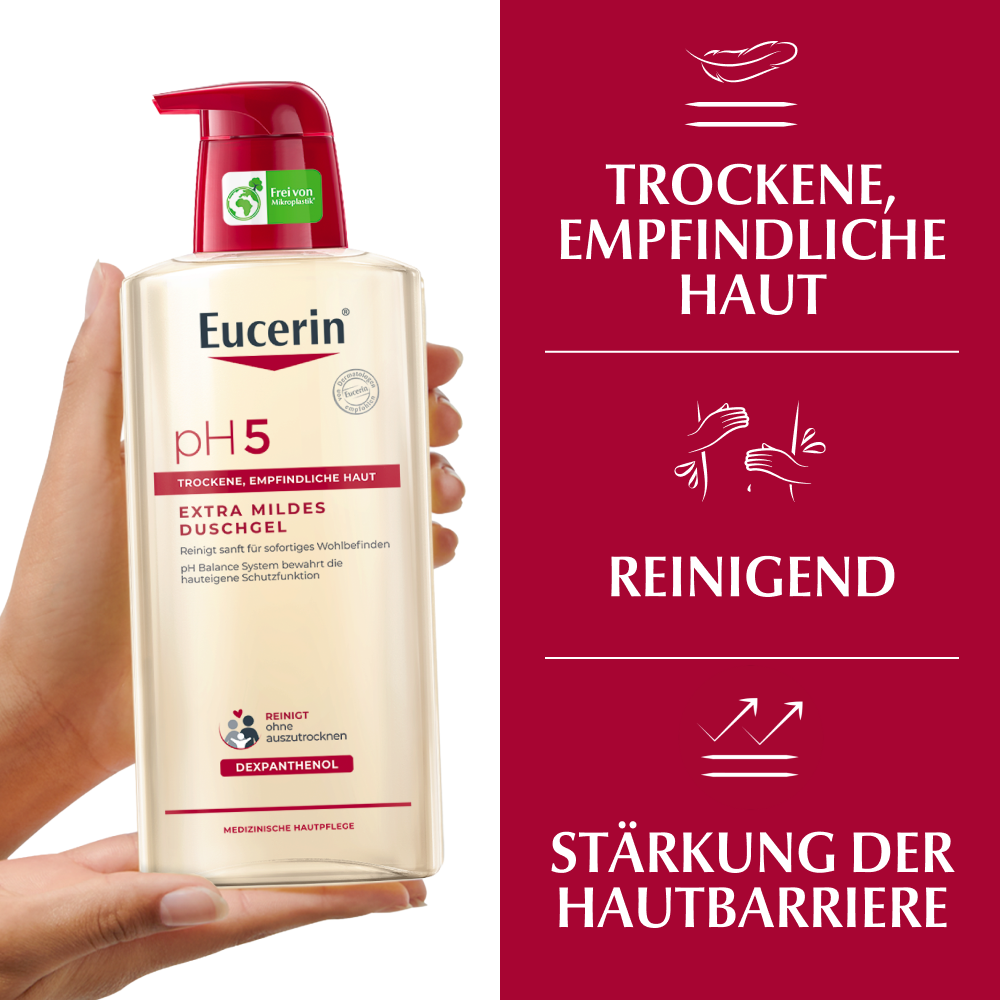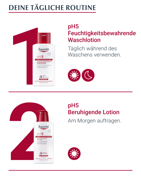 - Für beste Ergebnisse in Kombination mit einem feuchtigkeitsspendenden Pflegeprodukt aus der Eucerin PH5 Produktserie verwenden