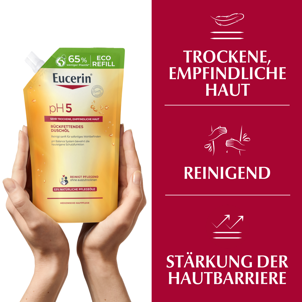 - Für beste Ergebnisse in Kombination mit einem feuchtigkeitsspendenden Pflegeprodukt aus der Eucerin pH5 Produktserie verwenden