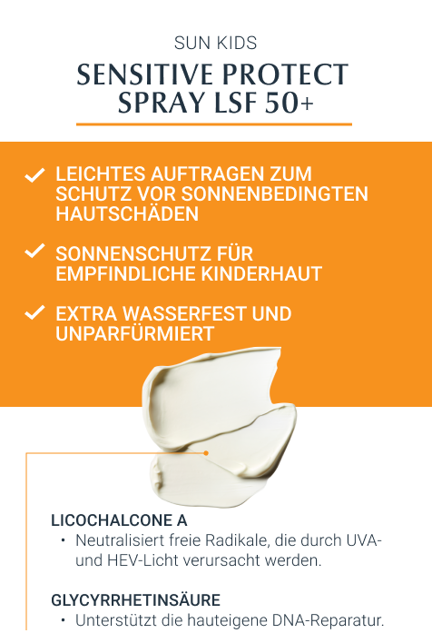 Sonneneinstrahlung kann besonders schädlich für Kinder und Babys sein, da ihre Haut noch sehr empfindlich ist. Das Sensitive Protect Kids Sun Spray LSF 50+ von Eucerin bietet hierfür den idealen Schutz. Mit der ADVANCED SPECTRAL TECHNOLOGY kombiniert der Sonnenschutz UVA/UVB-Filter mit Licochalcone A zur Neutralisierung freier Radikale. So sorgt die Kinder Sonnencreme zuverlässig für HEV- (hochenergetisches sichtbares Licht) und UV-Schutz. Das Sonnenschutzmittel wurde extra für Kinder und Babys entwickelt, um empfindliche Haut zu beruhigen und vor Sonnenbrand sowie langfristigen sonnenbedingten Schäden zu schützen.