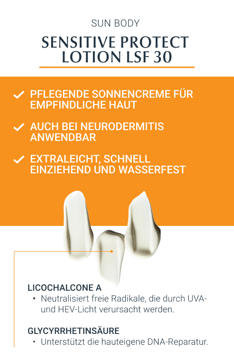 Neben UV-Strahlung kann auch das hochenergetische sichtbare Licht (HEV-Licht) die Haut beschädigen. Um dies zu verhindern und die Haut effektiv zu schützen, ist die Eucerin Sensitive Protect Body Sun Lotion Extra Light LSF 30 mit der Advanced Spectral Technology ausgestattet. In dieser Technologie kombiniert die Sonnencreme UVA/UVB-Filter mit Licochalcone A zur Neutralisation freier Radikale, die durch UV- und HEV-Licht ausgelöst werden. Zudem unterstützt Glycyrrhetinsäure den natürlichen Heilungsprozess der DNA.