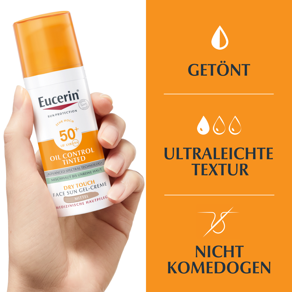 Eucerin Oil Control Tinted Face Sun Gel-Creme LSF 50+ Mittel ist ein Sonnenschutz mit Farbpigmenten für die tägliche Anwendung für unreine, zu Akne neigende Haut.