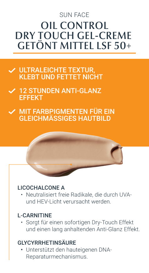 Die Oil Control-Technologie mit L-Carnitin und absorbierenden Mikropartikeln verleiht der Haut sofort ein trockenes Finish, sodass die mattierende Sonnencreme einen 12 Stunden Anti-Glanz-Effekt erzielt.