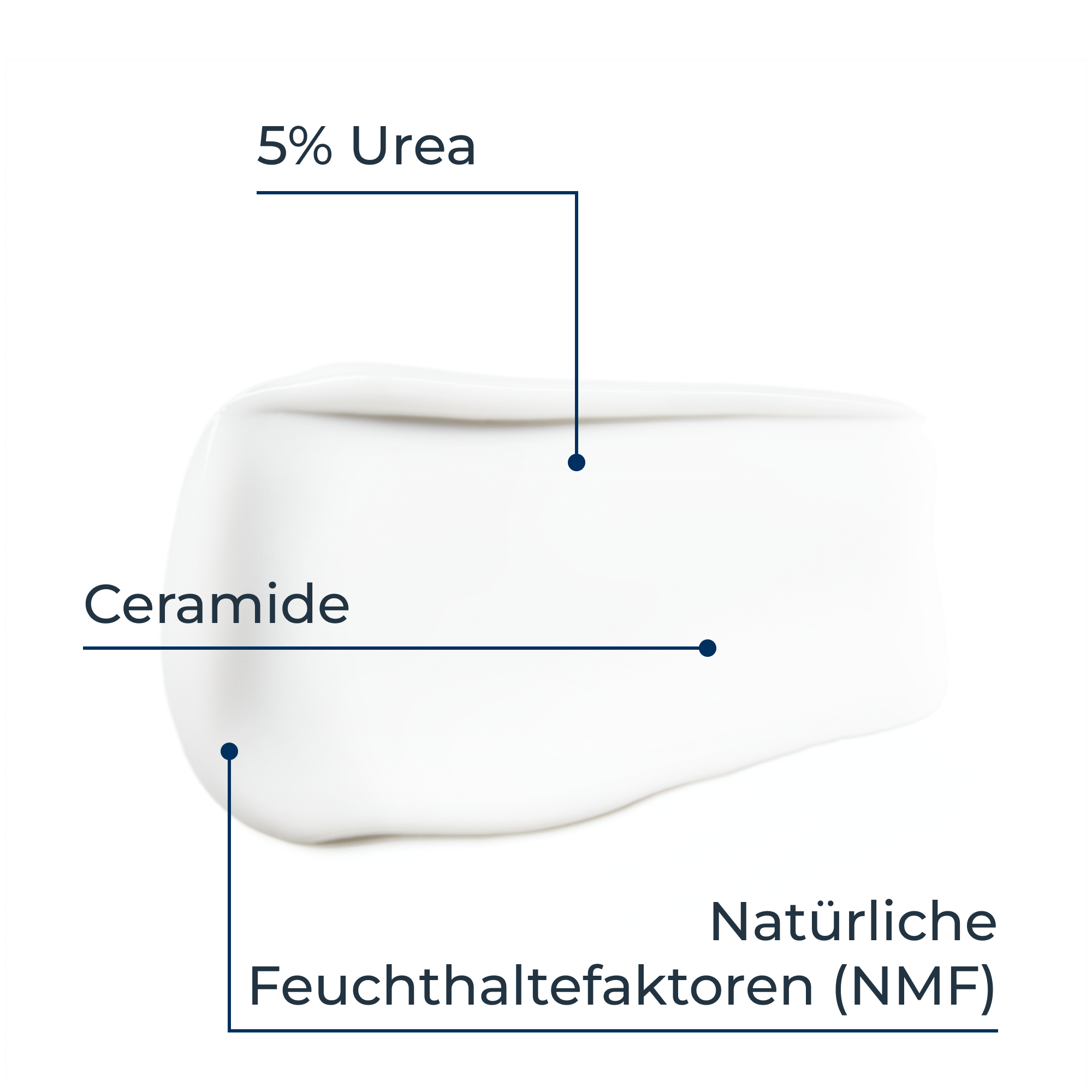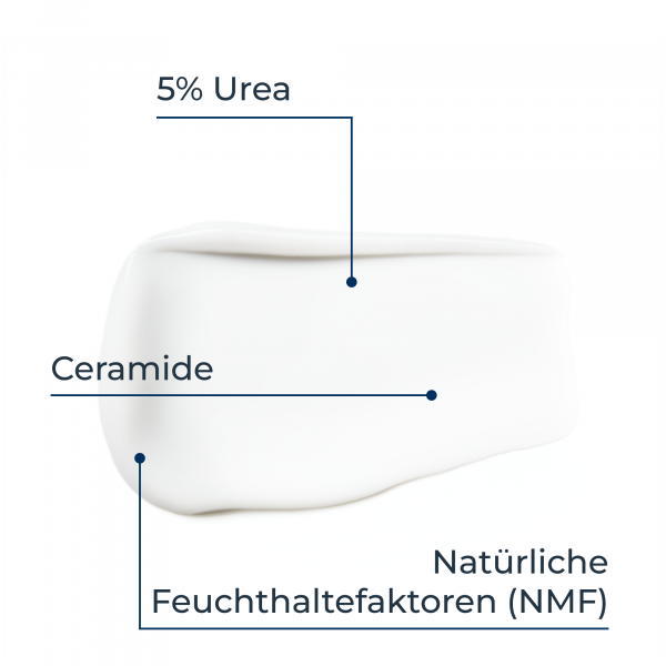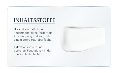Die Kombination der zwei natürlichen Wirkstoffe Urea und Lactat wirkt feuchtigkeitsbindend. Dies sorgt für eine schnelle und langanhaltende Versorgung mit Feuchtigkeit und raue Haut wird damit glatter – ein wirksamer Schutz gegen Trockenheit. Auch bei zu Schuppung neigender Haut und bei Juckreiz bietet die Creme eine wirksame Pflege.
