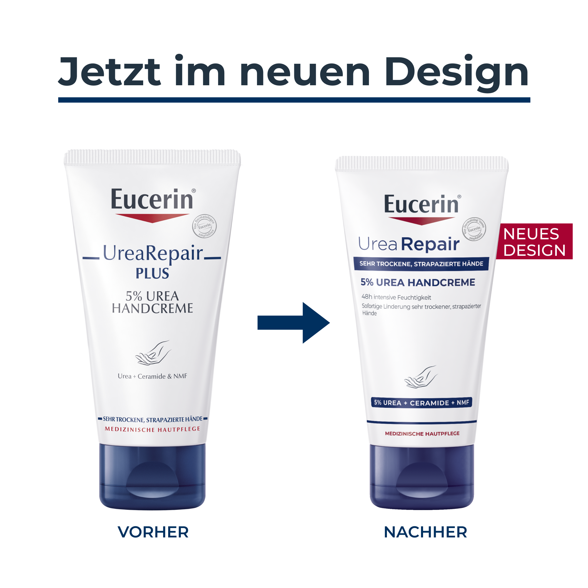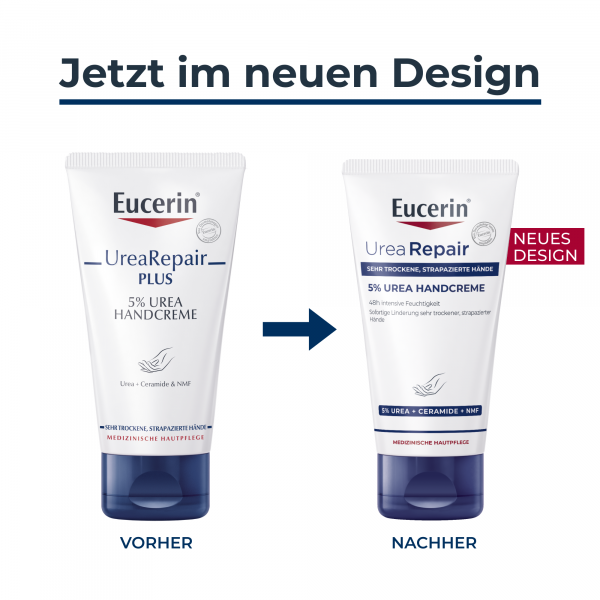 Die schnell einziehende und intensiv pflegende Eucerin UreaRepair PLUS Handcreme 5% spendet Feuchtigkeit und ist die ideale Pflege für sehr trockene, raue und strapazierte Hände. Die Zeichen sehr trockener Haut werden sofort gelindert und die Haut 48 Stunden vor Trockenheit geschützt – für eine gestärkte Hautbarriere und glatte, weiche Hände.