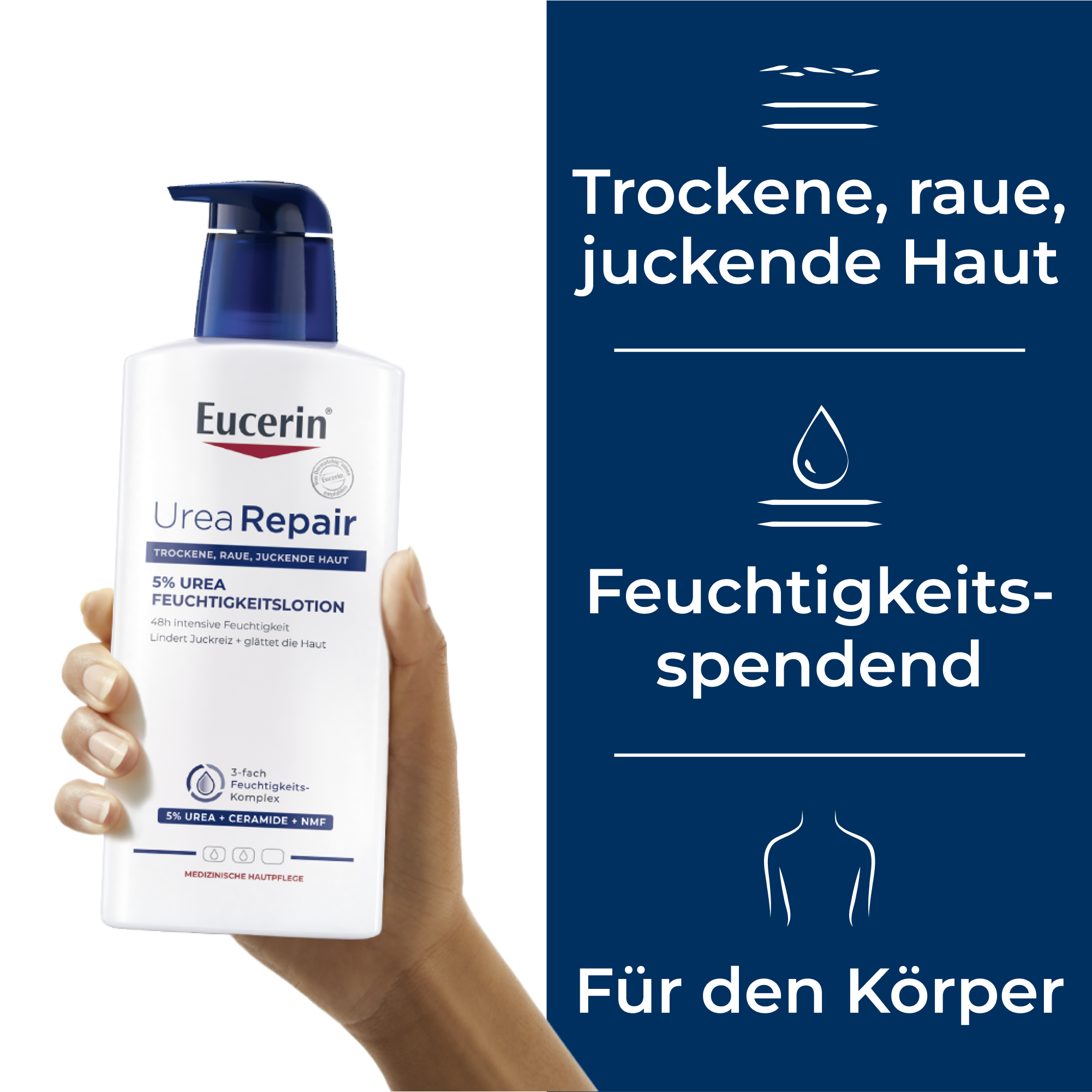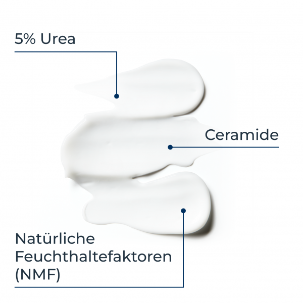 Der Repair-PLUS-Komplex in der Körpercreme verbessert die Feuchtigkeitsbindung der Haut und so wird der Feuchtigkeitsgehalt in den oberen Hautschichten deutlich erhöht. Dies wird durch die Kombination des Wirkstoffs Urea mit natürlichen Feuchthaltefaktoren erreicht. Zugleich stärken Ceramide die hauteigene Barriere, schützen und pflegen intensiv. Spannungsgefühl, Juckreiz oder eine raue Oberfläche werden sofort gelindert. Dafür bleibt ein glattes und geschmeidiges Hautgefühl.