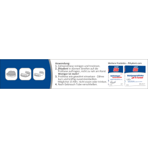 Das Produkt ist wasserlöslich und arbeitet nach dem "Kaugummi-Prinzip", dh. klebt anstatt nur zu haften. Damit ein Kaugummi an einer Fläche klebt, muss diese trocken sein. Daher besteht fittydent aus zwei Komponenten. Eine Komponente nimmt die Feuchtigkeit der Mundschleimhaut auf, damit eine trockene Oberfläche entsteht. Die zweite Komponente sorgt für den langanhaltenden "Klebe-Effekt" Die wasserunlösliche Haftcreme nimmt , wie ein Kaugummi, Feuchtigkeit auf und wird langsam weicher. Ab einem bestimmten Stadium geht der Klebe-Effekt in einen Haft-Effekt über. Jetzt lässt sich die Prothese problemlos herausnehmen. Die Klebe-Dauer hängt von der Menge der verwendeten Haftcreme ab.
