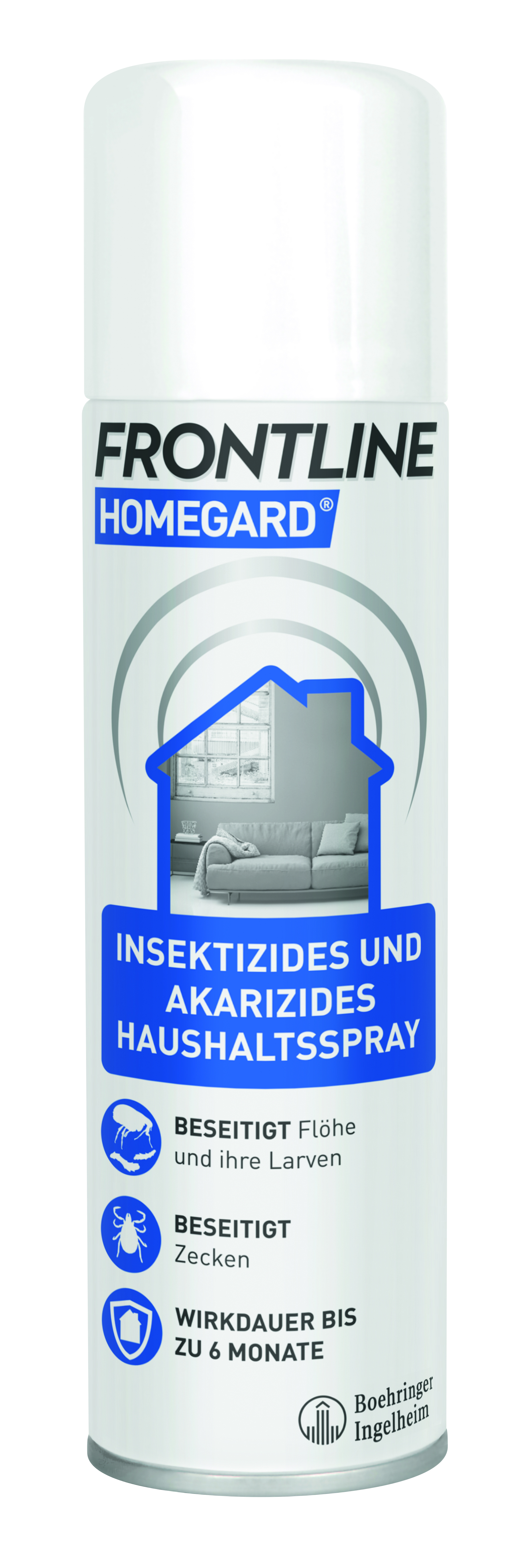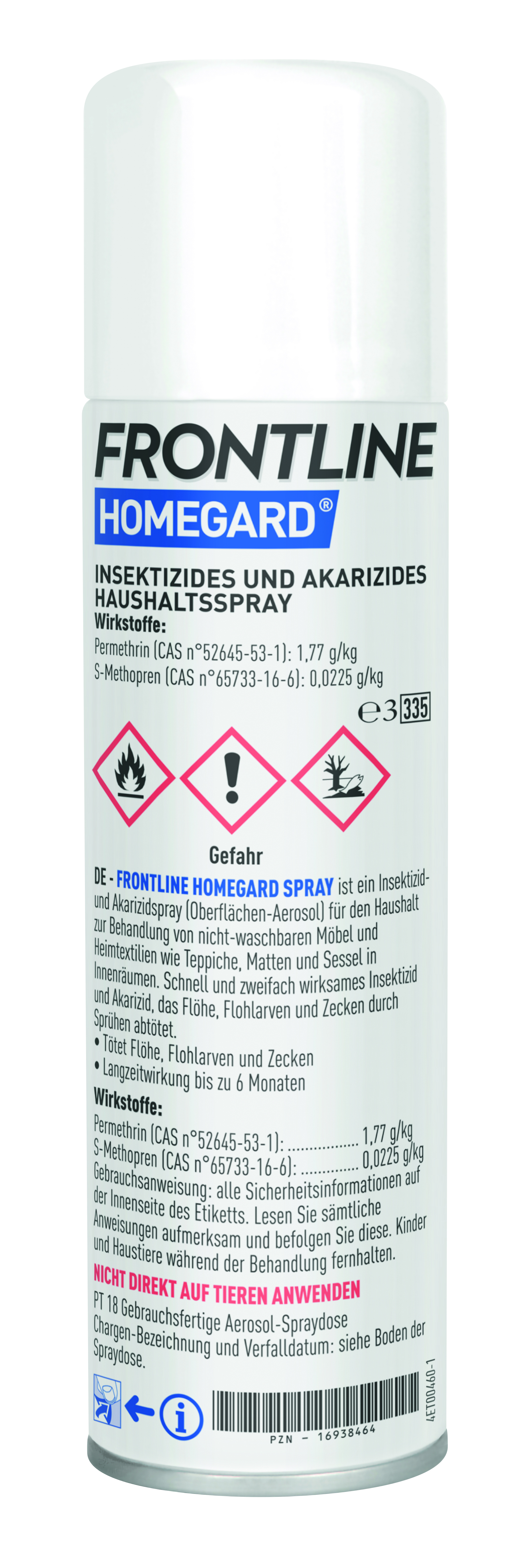 FRONTLINE HOMEGARD® enthält zwei Wirkstoffe. Permethrin, der erste Wirkstoff, leitet sich strukturell von den natürlichen Pyrethrinen ab, die von bestimmten Chrysanthemen-Arten gebildet werden. Sie werden in verschiedenen Produkten zur Schädlingsbekämpfung eingesetzt. Kommt ein Floh mit Permethrin in Kontakt, wird er durch den Wirkstoff gelähmt und schließlich abgetötet. (S)-Methopren, der zweite Wirkstoff, ähnelt einem Wachstumshormon der Flöhe. Er vermindert die Schlupffähigkeit der Floheier und verhindert die Entwicklung der Larven zu Flohpuppen. Durch diese Wirkweise wird die Vermehrung der Flöhe gehemmt. Beide Substanzen wirken gezielt im Parasiten und stellen bei bestimmungsgemäßem Gebrauch keine Gefahr für den Menschen dar.