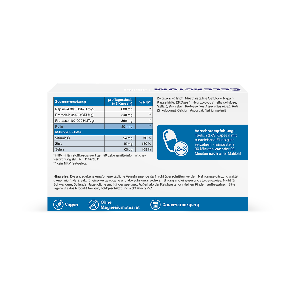 In GELENCIUM® Enzym Complex werden drei gezielt ausgewählte Enzyme hochdosiert kombiniert: Bromelain, Papain und Protease. Diese Kombination überzeugt mit einer überdurchschnittlich hohen Enzym-Tagesdosis von 1.500 mg sowie einer sehr hohen Enzymaktivität.