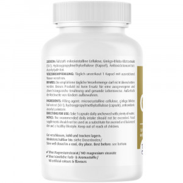 Ginkgo Biloba Blattextrakt (50:1) Pulver 20,8% (standardisiert auf 24 % Ginkoflavonglycoside und 6 % Terpene), Kapselhülle: Hydroxypropylmethylcellulose (HPMC), Füllstoff: mikrokristalline Cellulose, Trennmittel: Magnesiumsalze der Speisefettsäuren (pflanzlich)