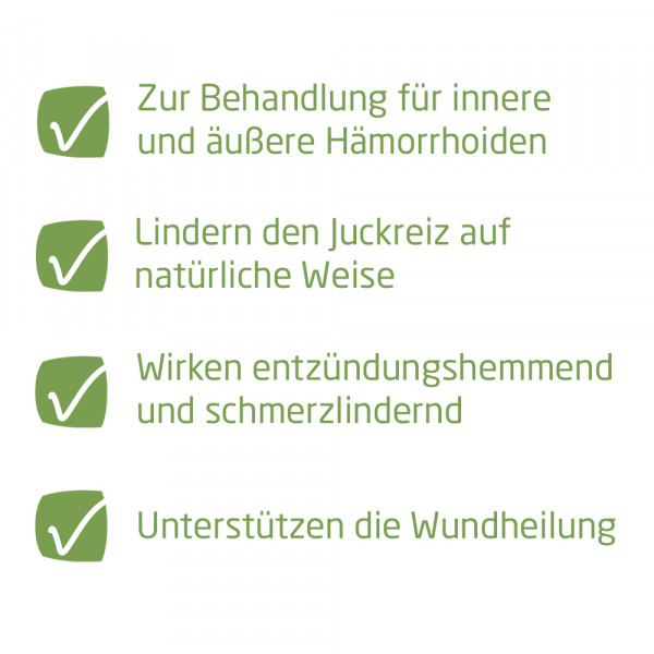 Weleda Hämorrhoidalzäpfchen strukturieren die schmerzhaft erweiterten Blutgefäße und geben ihnen neue Spannkraft. Die Gefäße können sich wieder zusammenziehen, eine schnellere Wundheilung wird ermöglicht. Die Wirkstoffe Rosskastanie, Zaubernuss und Stibium metallicum praeparatum wirken entzündungshemmend und dadurch schmerzlindernd. Sie unterstützen die Heilung der entzündeten Haut und lindern den unangenehmen Juckreiz.