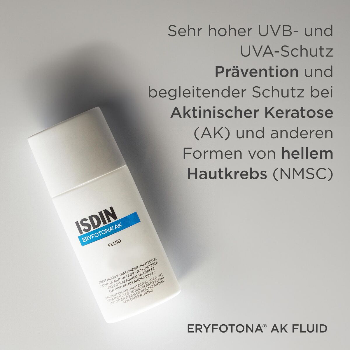- Prävention und begleitender Schutz bei Aktinischer Keratose (AK) und anderen Formen von Hellem Hautkrebs (NMSC). Verringert und verbessert das subklinisch betroffene Kanzerisierungsfeld im Rahmen einer AK oder NMSC.