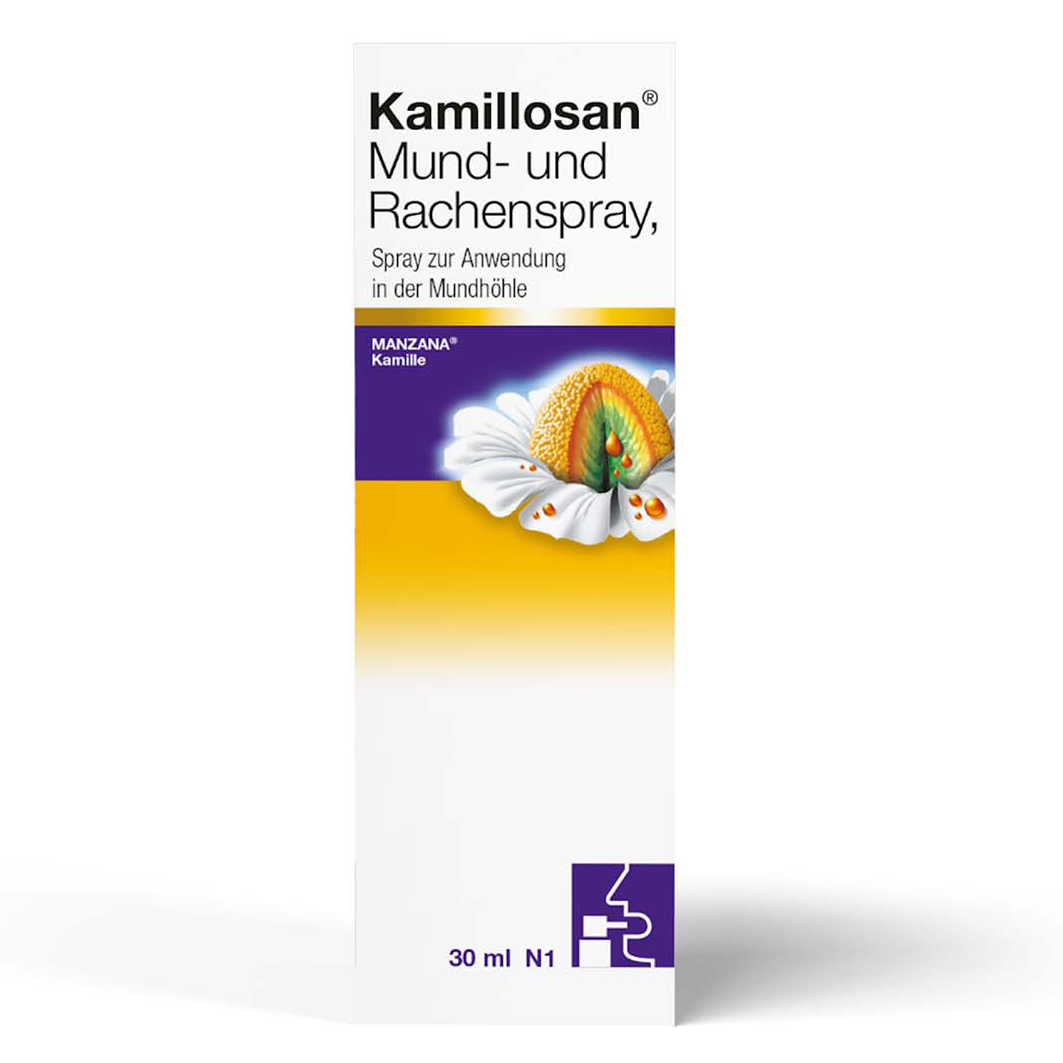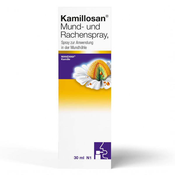 Kamillosan Mund- und Rachenspray ist ein pflanzliches Arzneimittel. Es ist ein Spray zur Anwendung in der Mundhöhle. Kamillosan Mund- und Rachenspray wird angewendet bei Rachenentzündungen (Tonsillopharyngitis) bei nicht fieberhaften Erkältungskrankheiten und bei Schleimhautentzündungen der Mundhöhle und des Zahnfleisches.