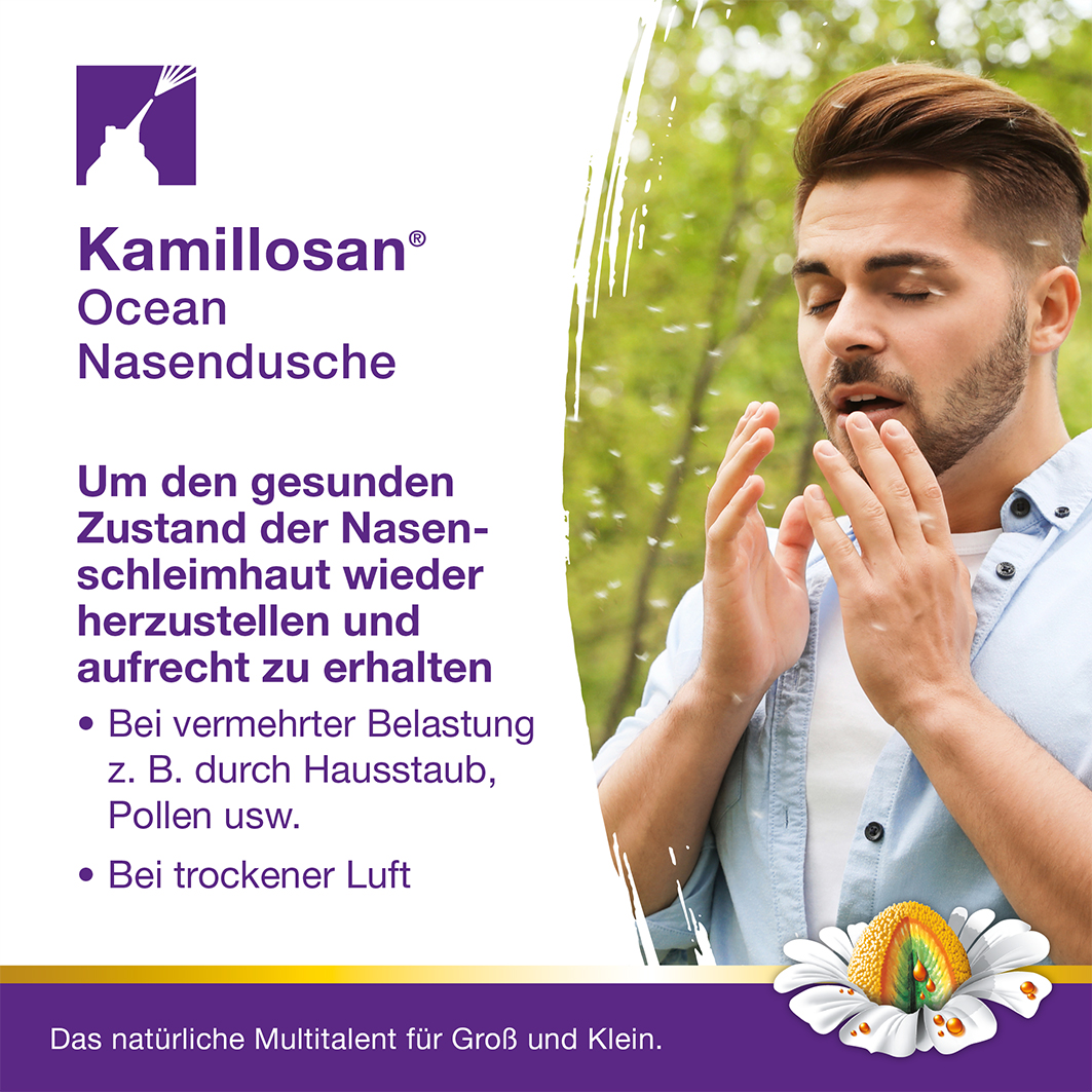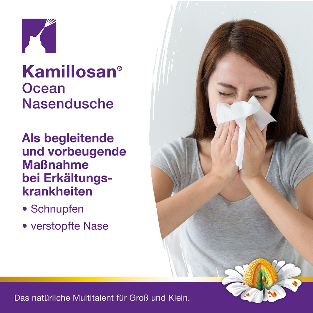 Eine gute tägliche Nasenpflege ist wichtig, denn Verkrustungen und Ablagerungen (z. B. getrockneter und zäher Schleim) können die Schleimhaut der Nase belasten und die oberen Atemwege verstopfen. Eine wunde, brennende Nasenschleimhaut zeigt sich häufig bei Erkältungskrankheiten. Das Gefühl einer trockenen Nase kann zum Beispiel beim längeren Aufenthalt in trockener Heizungsluft entstehen, weil diese eine Austrocknung der Atemwege und somit eine trockene Nasenschleimhaut fördert. Dank Kamillosan® Ocean Nasendusche ist eine wirksame Reinigung der Nase möglich. So werden Schleim, Krankheitserreger, Schmutz und Pollen aus der Nase gespült und die Schleimhäute gleichzeitig befeuchtet.