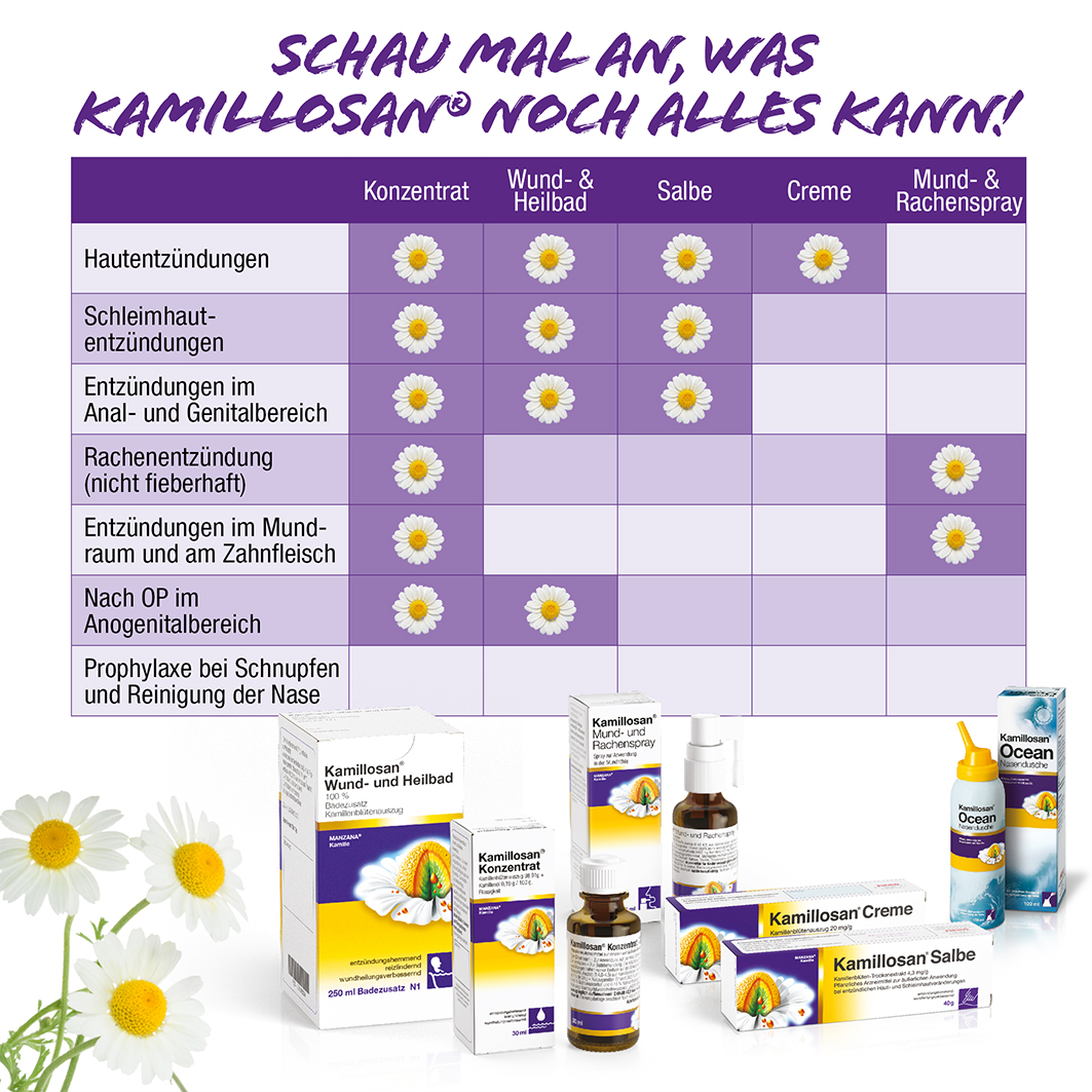 Kamillosan® Ocean Nasendusche darf aufgrund des Zusatzes von Kamillenextrakt nicht angewendet werden bei Überempfindlichkeit (Allergie) gegenüber Korbblütlern wie z. B. Arnika, Kamille, Ringelblume und Schafgarbe. Wechselwirkungen mit anderen Mitteln sind nicht bekannt. Es bestehen keine Bedenken gegen die Anwendung von Kamillosan® Ocean Nasendusche während der Schwangerschaft und Stillzeit.