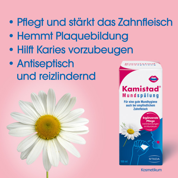 Gerade bei empfindlichem Zahnfleisch gehört zur Mundhygiene mehr als nur Zähneputzen. Kamistad® Mundspülung pflegt und befeuchtet das empfindliche Zahnfleisch und die empfindliche Mundschleimhaut. Das enthaltene Chlorhexidin hat antiseptische und desinfizierende Eigenschaften und beugt der Bildung von Plaque und Karies vor, Hyaluronsäure wirkt feuchtigkeitsspendend und reizlindernd und Kamille hat entzündungshemmende und heilungsfördernde Eigenschaften.