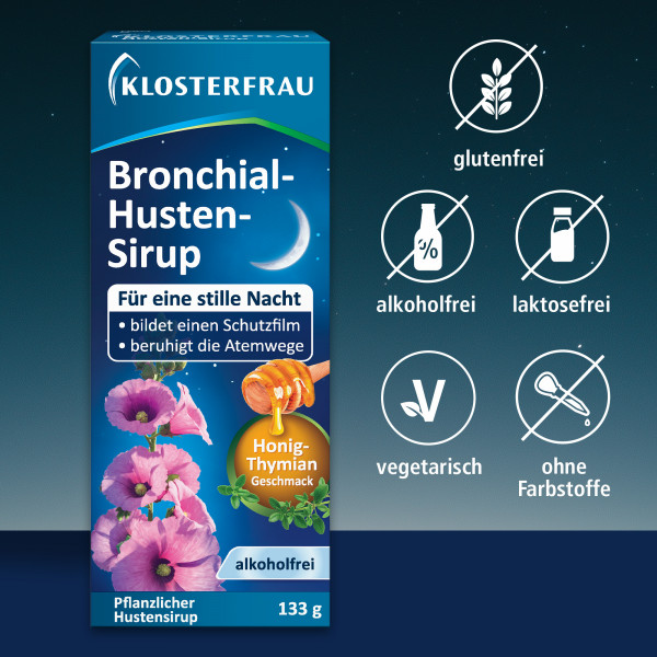 Kurz vor dem Zubettgehen eingenommen, können sich die Schleimhäute beruhigen und der lästige Hustenreiz wird gelindert. Damit sorgt der alkoholfreie Klosterfrau Bronchial-Husten-Sirup mit leckerem Thymian-Geschmack für eine stille Nacht.