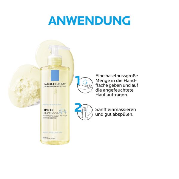 Schäumen Sie das rückfettende LIPIKAR DUSCH- UND BADEÖL AP+ in den Händen auf, tragen Sie es auf die feuchte Haut auf und spülen es ab. Für die Anwendung in der Badewanne geben Sie fünf Pumpstöße in das Badewasser, während sich die Wanne mit Wasser füllt.