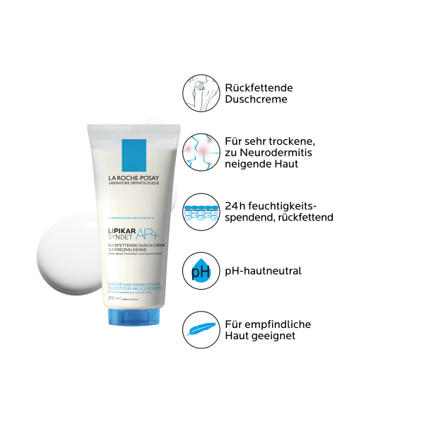 Die LIPIKAR SYNDET AP+ RÜCKFETTENDE DUSCH-CREME von La Roche-Posay ist eine Körperreinigung ohne Duftstoffe. Das sanft reinigende Cremegel eignet sich als Basispflege zum Duschen bei zu Neurodermitis neigender, empfindlicher und sehr trockener Haut. Durch die rückfettende Eigenschaft wirkt die LIPIKAR SYNDET AP+ DUSCH-CREME hautberuhigend und juckreizlindernd. Das Cremegel lässt sich leicht und schonend auf die Haut auftragen, ohne in den Augen zu brennen oder die Haut auszutrocknen. Es ist für Säuglinge, Kinder und Erwachsene geeignet. Angereichert mit Niacinamid und dem exklusiven Wirkstoff Aqua Posae Filiformis lindert LIPIKAR SYNDET AP+ den Juckreiz bereits unter der Dusche. Die in der Formulierung enthaltene Sheabutter pflegt empfindliche Haut zusätzlich. Ergänzend zu LIPIKAR SYNDET AP+ eignet sich der rückfettende Körperbalsam LIPIKAR BAUME AP+. Die Pflegeprodukte der LIPIKAR AP+ Serie von La Roche-Posay sind für die ganze Familie und als täglicher Begleiter geeignet. Hinweis: Grundsätzlich sollte langes und heißes Duschen vermieden werden. Nach dem Duschen die Haut nicht trocken reiben, sondern sanft abtupfen. Die Pflege ist nicht zur Einnahme geeignet. Kleinkinder sollten das Produkt nur unter Aufsicht von Erwachsenen verwenden.