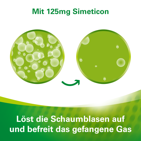 Medizinprodukt zur symptomatischen Behandlung gasbedingter Magen-Darm-Beschwerden, z. B. Blähungen (Meteorismus), zur Vorbereitung der Diagnostik im Bauchbereich, wie z. B. Endoskopie, Röntgen und Sonographie. Flüssigkapseln mit Simeticon.