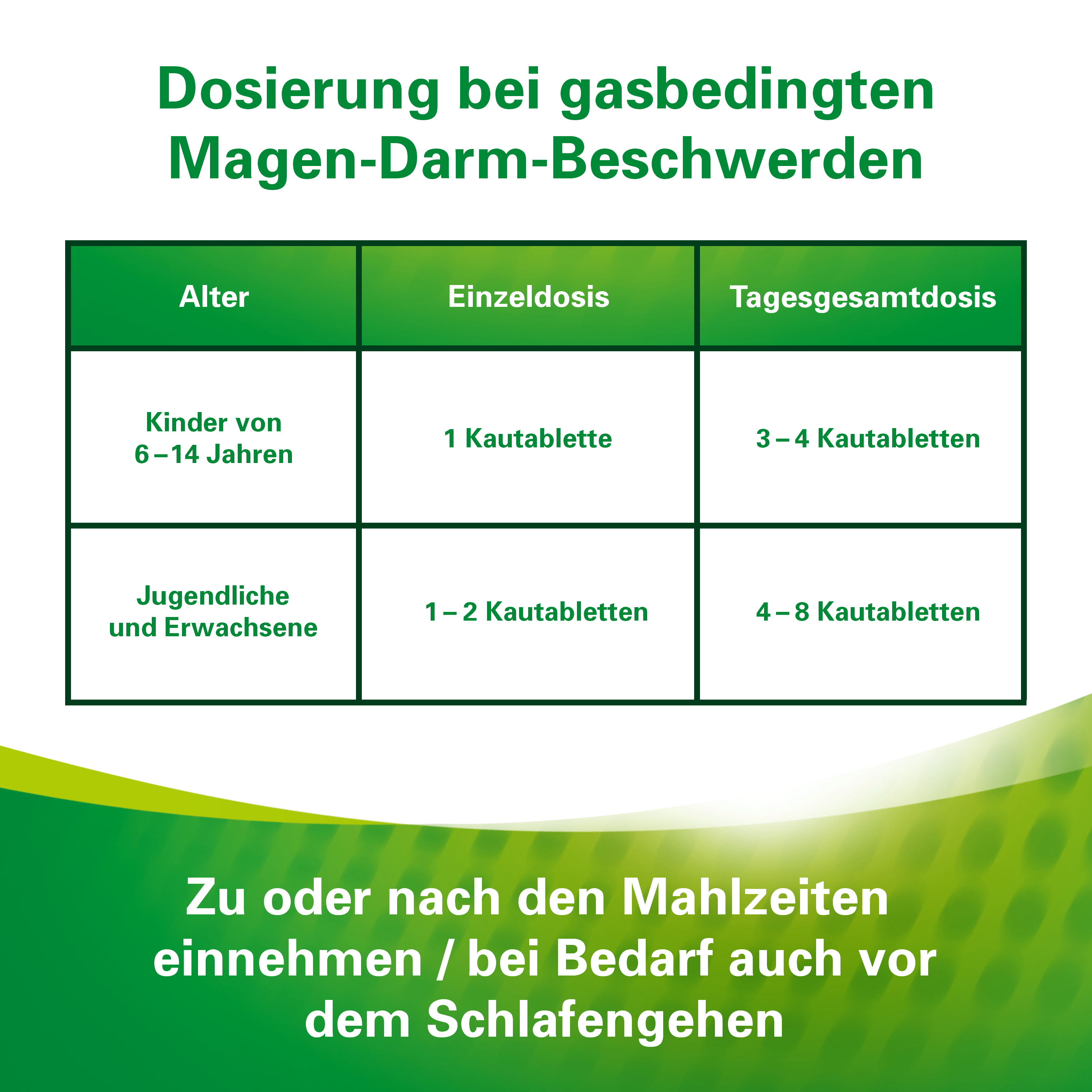| Kinder ab 6 Jahren und Erwachsene | 2 Kautabletten | 3-mal täglich | morgens, mittags und abends, zu oder nach der Mahlzeit |