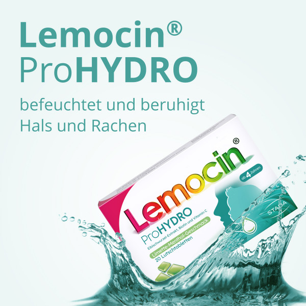 Mehr Feuchtigkeit für zwischendurch: Das Nahrungsergänzungsmittel Lemocin® ProHYDRO kann eine passende Ergänzung zwischen der Anwendung von Lemocin® sein. Die Lutschtabletten können zur Unterstützung der Regeneration der Schleimhäute im Alltag zum Einsatz kommen.