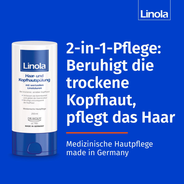 Die Linola Haar- und Kopfhautspülung beruhigt und entspannt trockene und empfindliche Kopfhaut, glättet die Haaroberfläche und sorgt gleichzeitig für geschmeidige Haare. Die milde Formulierung ist abgestimmt auf die speziellen Bedürfnisse trockener, sensibler Kopfhaut. Der hautfreundliche pH-Wert und wertvolle Linolsäuren pflegen die Haare, sind sanft zur Kopfhaut und lindern Trockenheit.