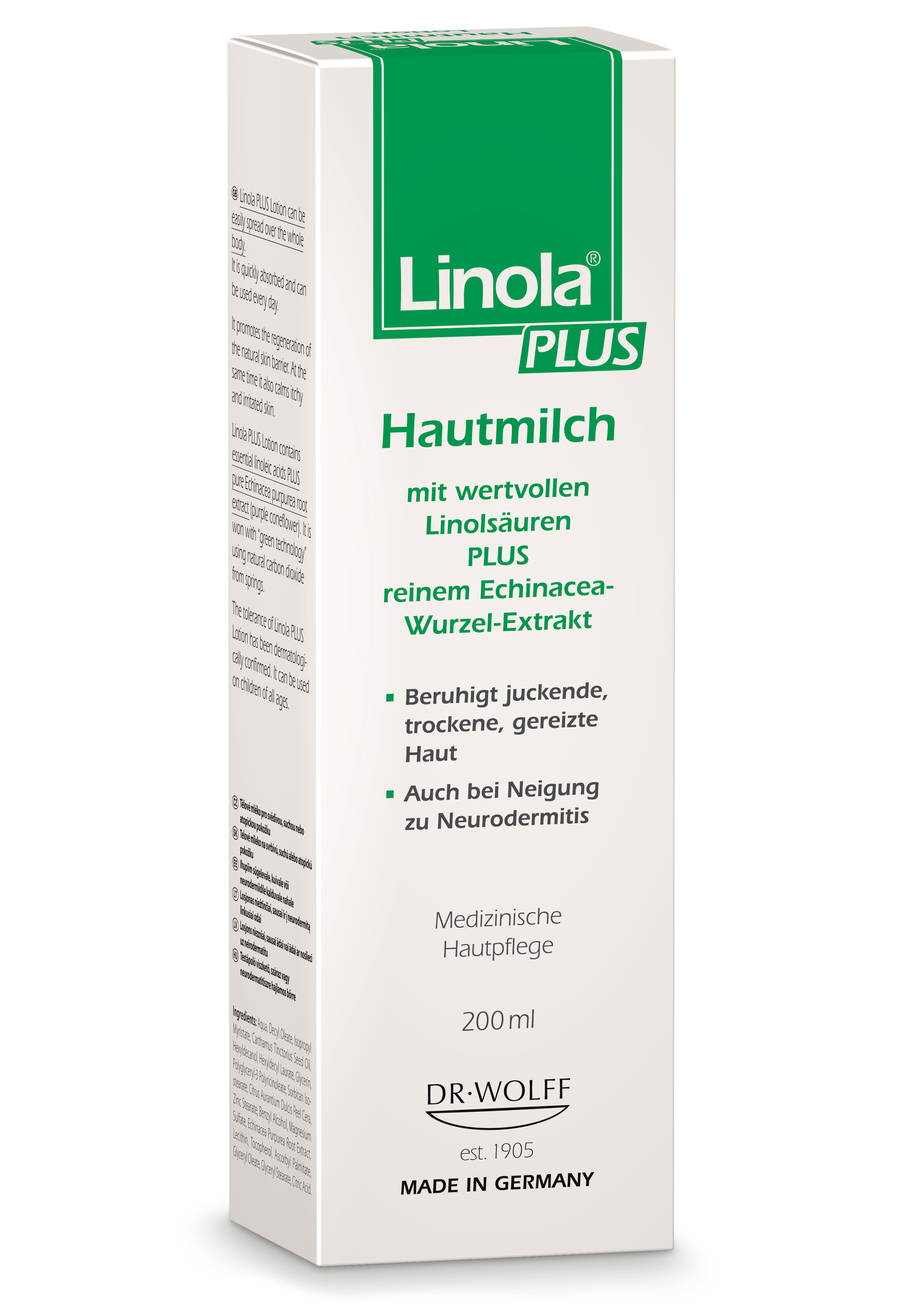 Linola PLUS Hautmilch lässt sich sehr gut auf großen Hautpartien verteilen. Sie zieht auch schnell ein. Den charakteristischen Duft auf der Haut verdankt sie dem Echinacea-Wurzel- Extrakt. Linola PLUS Hautmilch zeichnet sich durch ihre einzigartige Formulierung aus wertvollem Linolsäurereichen Distelöl sowie einem besonderen Pflanzenextrakt aus der Wurzel der Echinacea purpurea (Purpur-Sonnenhut) aus. Traditionell wurden und werden Extrakte aus Echinacea purpurea wegen ihrer gesundheitsfördernden Eigenschaften bei verschiedensten Hautproblemen eingesetzt. Der in Linola PLUS verwendete Extrakt wird mithilfe „Grüner Technologie“ schonend und besonders rein gewonnen. Hierbei wird allein natürliche Quellkohlensäure verwendet. Im Gegensatz zu anderen Verfahren können bei dieser Art von Herstellung keine Lösungsmittelrückstände im Extrakt zurückbleiben. In einem geschlossenen Kreislaufsystem wird die eingesetzte Kohlensäure vollständig recycelt.