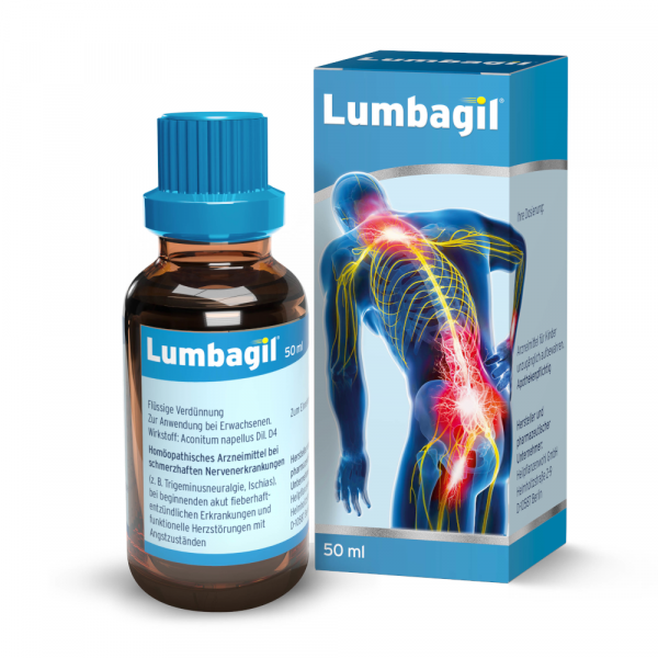 In LUMBAGIL® wurde die gegen Neuralgien (Nervenschmerzen) hochwirksame Arzneipflanze Aconitum napellus (Blauer Eisenhut) in Tropfenform speziell aufbereitet. Die Wirkung des gut verträglichen Pflanzenstoffes wurde in wissenschaftlichen Studien umfangreich untersucht und bestens dokumentiert. In LUMBAGIL® wird der natürliche Arzneistoff unter modernsten Laborbedingungen und in besonderer Dilution entsprechend des deutschen Arzneimittelbuchs aufbereitet. LUMBAGIL® ist vegan, glutenfrei, laktosefrei, fructosefrei, nussfrei und sojafrei. LUMBAGIL® enthält Alkohol.