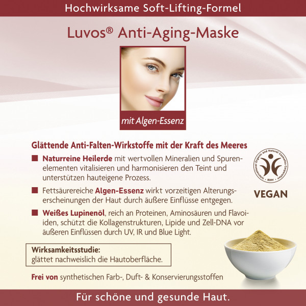 Zertifizierte Naturkosmetik, hergestellt in Deutschland: das Familienunternehmen Luvos mit 100-jähriger Tradition stellt dieses Produkt nach höchstem Standard von BDIH her. Es ist selbstverständlich vegan, tierversuchsfrei. Die Hautverträglichkeit ist dermatologisch bestätigt. Die Anti-Aging-Maske ist vollkommen frei von problematischen Zusatzstoffen wie Mikroplastik, Mineralöl, Parabenen, Silikonen, Paraffinen, PEGs, künstlichen Farb-, Duft- und Konservierungsstoffen.