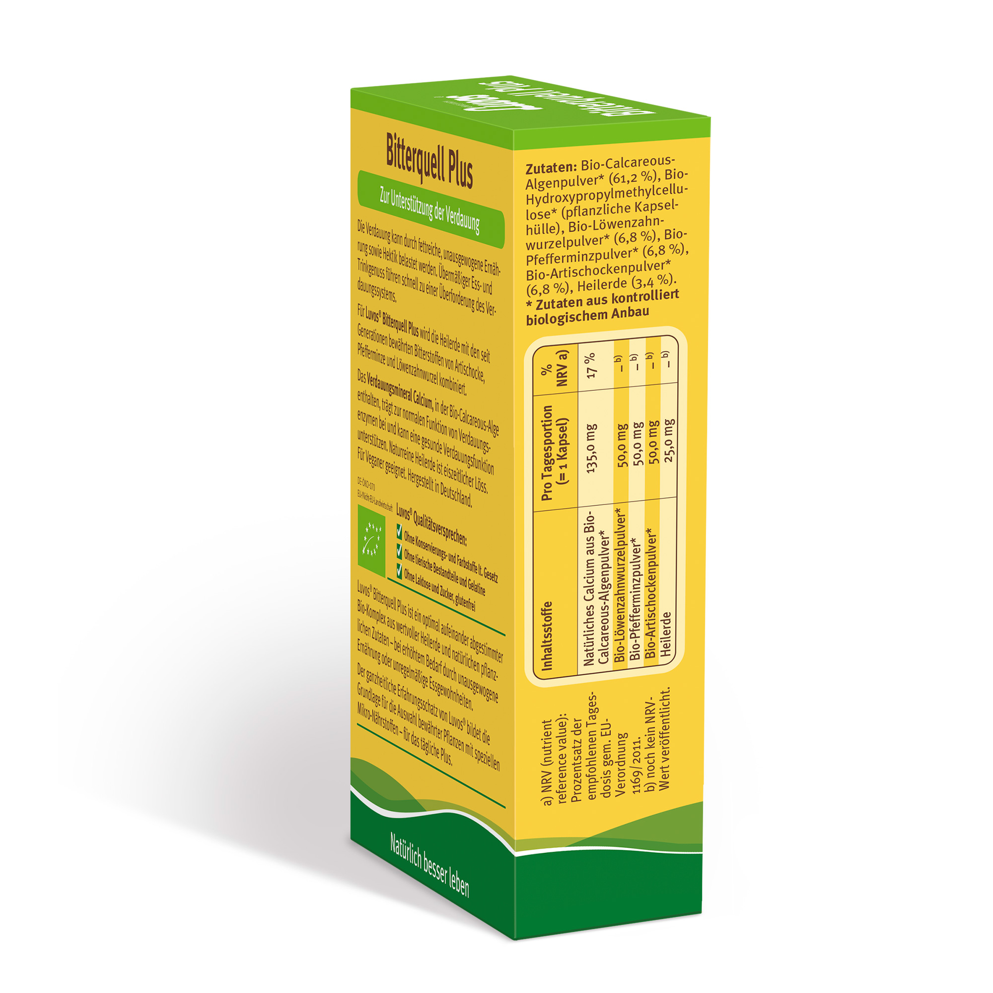 Luvos Bitterquell Plus ist ein optimal abgestimmter Bio-Komplex mit Heilerde und natürlichen, bio-zertifizierten Zutaten. Das hochwertige Naturprodukt kombiniert die Heilerde mit bewährten pflanzlichen Naturstoffen: Bio-Artischocke, Bio-Pfefferminze und Bio-Löwenzahnwurzel. Das Verdauungsmineral Calcium, in der Bio-Calcareous-Alge enthalten, trägt zur normalen Funktion von Verdauungsenzymen bei und kann eine gesunde Verdauungsfunktion unterstützen.