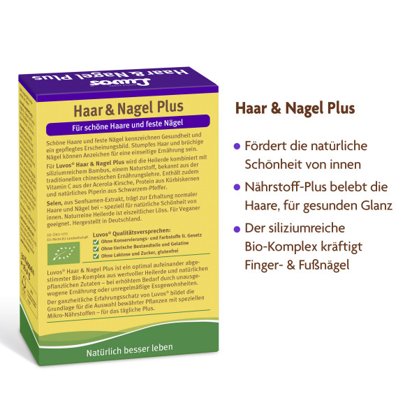 Luvos Haar & Nagel Plus ist ein optimal abgestimmter Bio-Komplex mit Heilerde und bio-zertifizierten pflanzlichen Zutaten. In dem hochwertigen Naturprodukt ist Heilerde mit bewährten pflanzlichen Naturstoffen kombiniert: mit siliziumreichem Bio-Bambus, Bio-Senfsamen-Extrakt, Bio-Kürbiskern-Protein und dem Bio-Enhancer Piperin aus Schwarzem Pfeffer. Enthält zudem Vitamin C aus der Acerola-Kirsche. Selen, aus dem Senfsamen-Extrakt, trägt zur Erhaltung normaler Haare und Nägel bei.