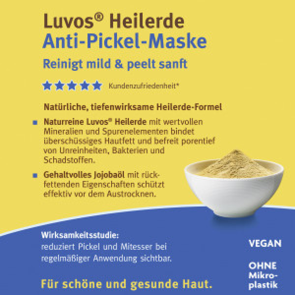Die Luvos Anti-Pickel-Maske lässt irritierte, unreine Gesichtshaut blitzschnell gesünder und klarer aussehen. Die natürlich-effektive Rezeptur reinigt sanft und gründlich, befreit nachweislich von Pickeln, Mitessern, minimiert vergrößerte Poren.