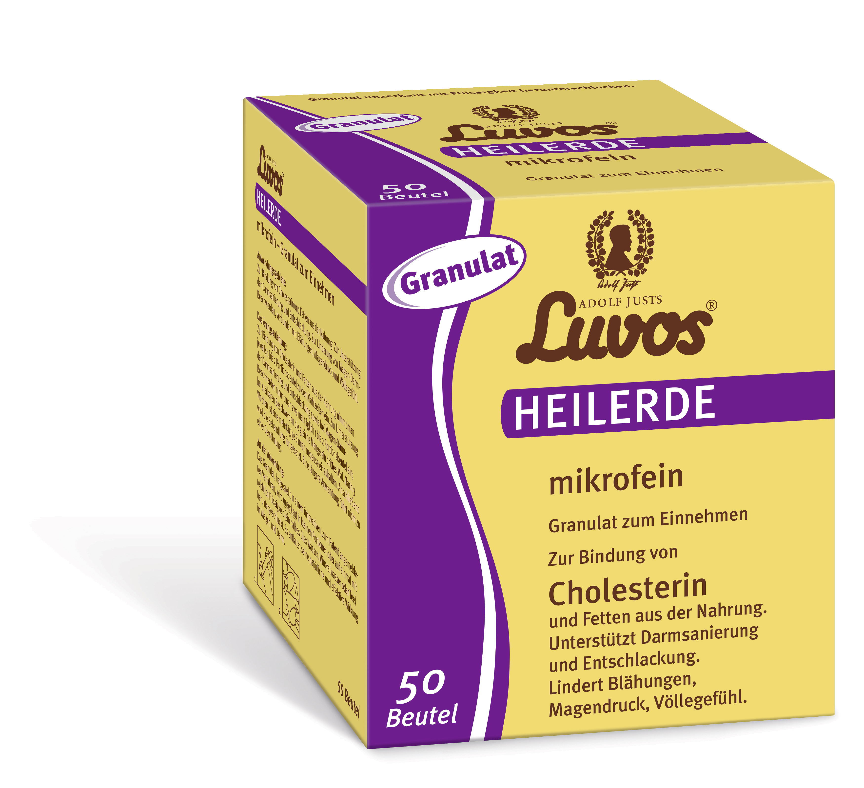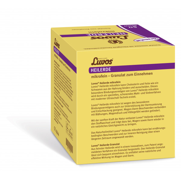 Adolf Justs Luvos® Heilerde mikrofein Pulver ist ein Medizinprodukt, das als mineralisches Magen-Darm-Mittel zur Bindung von Cholesterin und Fetten aus der Nahrung, zur Unterstützung der Darmsanierung und Entschlackung sowie zur Linderung von Magen-Darm-Beschwerden, verbunden mit Blähungen, Magendruck und Völlegefühl verwendet wird.