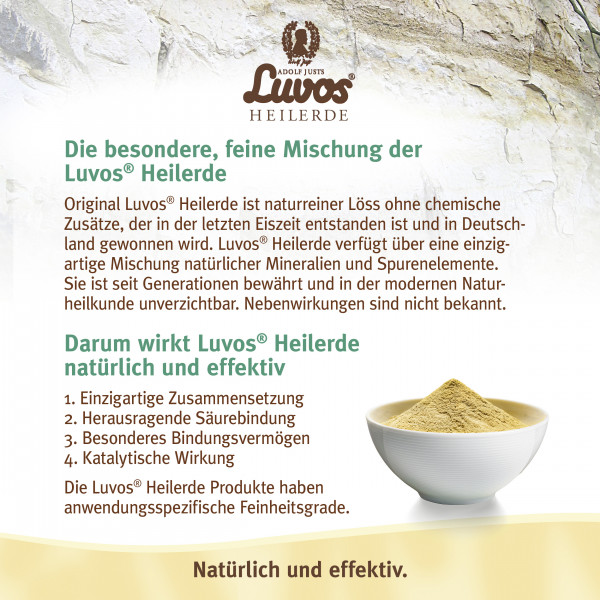 Luvos-Heilerde ist das einzige in Deutschland zugelassene Naturarzneimittel gegen Sodbrennen, säurebedingte Magenbeschwerden und Durchfall mit dem Wirkstoff Heilerde. Luvos-Heilerde ist ein reines Naturprodukt, das in Deutschland aus eiszeitlichem Löss gewonnen wird. In einem speziellen Verfahren wird der Luvos-Löss schonend aufbereitet; dadurch erhält die Luvos-Heilerde ihre idealen Eigenschaften für die therapeutische Anwendung. Entsprechend der gewünschten Wirkung haben die Heilerde-Produkte von Luvos anwendungsspezifische Feinheitsgrade. Luvos-Heilerde enthält keine Zusatzstoffe und ist auch für Veganer geeignet.