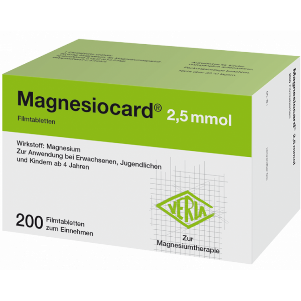 Magnesiocard® 2,5 mmol bewährt sich seit vielen Jahren als Arzneimittel mit höchsten Qualitätsstandards in der Therapie von Magnesiummangelzuständen. Magnesium wird am besten vom Körper aufgenommen, wenn kleinere Mengen über den Tag verteilt eingenommen werden. Durch die niedrige Dosierung von Magnesiocard® 2,5 mmol ist es individuell gut dosierbar und kann ganz nach Bedarf zu verschiedenen Tageszeiten eingenommen werden. Dies erhöht die Bioverfügbarkeit von Magnesium, da kleine Mengen effektiver aufgenommen werden können als große Einmal-Dosen. Magnesiocard® 2,5 mmol enthält zudem das organische Magnesiumaspartat-Hydrochlorid für eine gute Aufnahme im Körper.