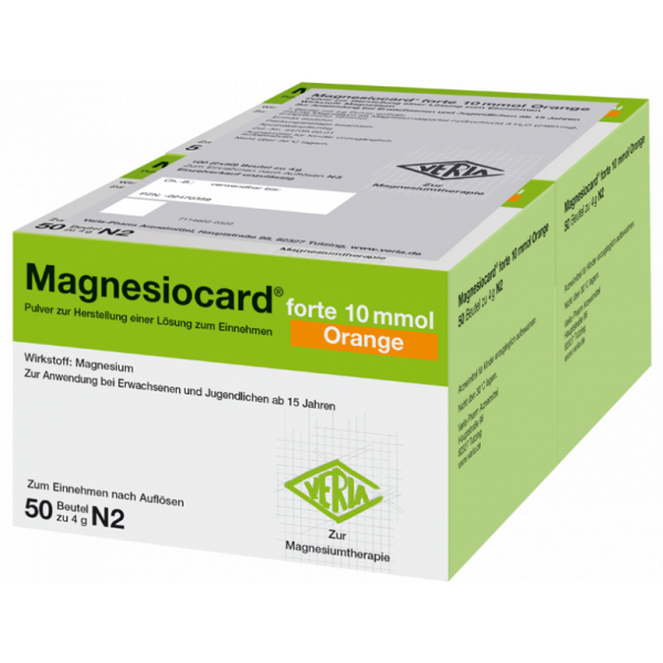 Magnesiocard® forte 10 mmol Orange bewährt sich seit vielen Jahren als Arzneimittel mit höchsten Qualitätsstandards in der Therapie von Magnesiummangelzuständen. Das hochwertige Pulver schmeckt fruchtig nach Orange und kann einfach mit Wasser angerührt werden. So wird auch die tägliche Flüssigkeitsaufnahme unterstützt. Das aufgelöste Pulver ist außerdem nicht brausend, eine gute Alternative für alle, die Brausetabletten als unangenehm empfinden. Magnesiocard® forte 10 mmol Orange enthält zudem organisches Magnesiumaspartat-Hydrochlorid für eine gute Aufnahme und Bioverfügbarkeit im Körper.