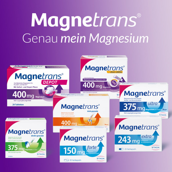 Magnesium hat für die normale Funktion unserer Muskeln und unseres Nervensystems große Bedeutung. Aber stressige Zeiten, große körperliche Anstrengungen oder ein sportlicher oder sehr aktiver Lifestyle können für einen erhöhten Magnesiumbedarf sorgen.Magnetrans® Depot 400mg unterstützt den Körper mit einer modernen 2-Phasen-Technologie mit insgesamt 400mg Magnesium. Der spezielle Aufbau der Tablette sorgt dafür, dass ein Teil des enthaltenen Magnesiums sofort nach der Einnahme innerhalb der ersten ca. 45 Minuten freigesetzt wird, während die verzögert einsetzende Depot-Phase ihn anschließend über mehrere Stunden hinweg mit Magnesium versorgt.