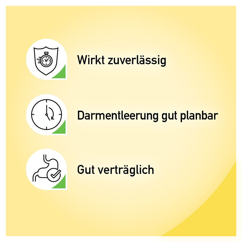 Der Wirkstoff verhindert, dass aus dem Darminhalt Wasser und Salze entzogen werden. Gleichzeitig fördert er das Einströmen von Wasser und Salzen in den Darm. Dadurch gewinnt der Darminhalt an Volumen und wird weicher, was zu einem Stuhldrang und einer erleichterten Stuhlentleerung führt.