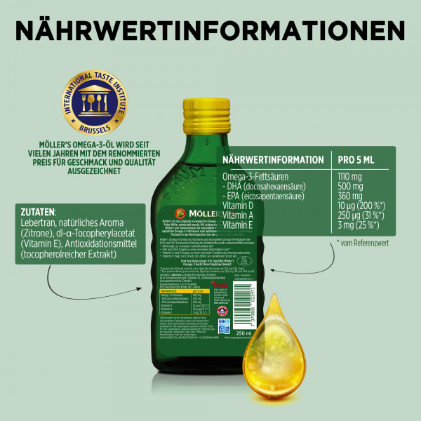 Möller’s ist das wohlschmeckende, original norwegische Omega-3-Öl, das seit 1854 einen wertvollen Beitrag zur Gesundheit der skandinavischen Bevölkerung leistet. Omega-3-Fettsäuren gehören zu den lebenswichtigen Nährstoffen, die der Körper nicht selbst produzieren kann. Sie kommen v.a. in fettem Fisch wie Lachs oder Hering vor, aber wer nicht gerne Fisch isst, kann mit nur einem Teelöffel Möller‘s pro Tag seinen Bedarf ganz einfach und bekömmlich decken. Möller’s – Ein Löffel voll Leben für die ganze Familie.