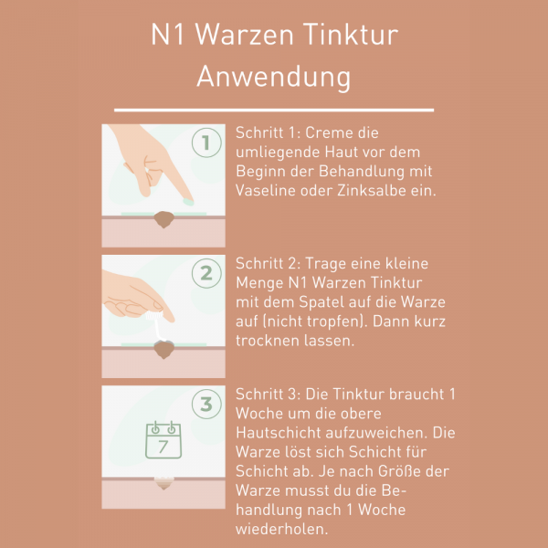 Um zu verhindern, dass die Haut um die Warze herum angegriffen wird, muss die umliegende Haut vor dem Beginn der Behandlung vor der Ätzwirkung der Flüssigkeit mit Vaseline oder Zinksalbe geschützt werden. Trage nun eine kleine Menge N1 Warzen Tinktur mit dem Spatel auf die Warze auf (nicht tropfen). Achte darauf, dass du die N1 Warzen Tinktur nur auf die Warze gibst. Dann kurz trocknen lassen. Die Warze braucht nicht abgedeckt zu werden. Innerhalb einer Woche löst sich die Warze Schicht für Schicht. Die Flüssigkeit braucht eine Woche, um die obere Hautschicht aufzuweichen. Du siehst also nicht gleich nach dem Auftragen ein Ergebnis. Nach einiger Zeit werden die Warzenzellen zerstört, die Warze wird weiß und wird abgestoßen. N1 Warzen Tinktur nicht häufiger als ein Mal pro Woche auftragen. Je nach Größe und Dicke der Warze kann es notwendig sein, die Behandlung mit der N1 Warzen Tinktur nach einer Woche zu wiederholen. Warzen sind ansteckend. Darum wird von der Verwendung des Produkts durch mehrere Personen abgeraten.