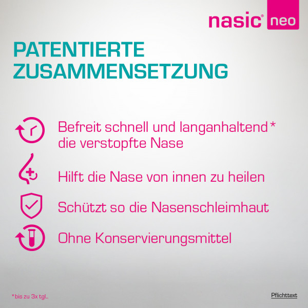 nasic® neo Nasenspray, eine Weiterentwicklung des bewährten nasic® O.K., enthält neben dem abschwellenden Wirkstoff Xylometazolin und dem wundheilungsfördernden Wirkstoff Dexpanthenol den weiteren sonstigen Bestandteil Hyaluron.