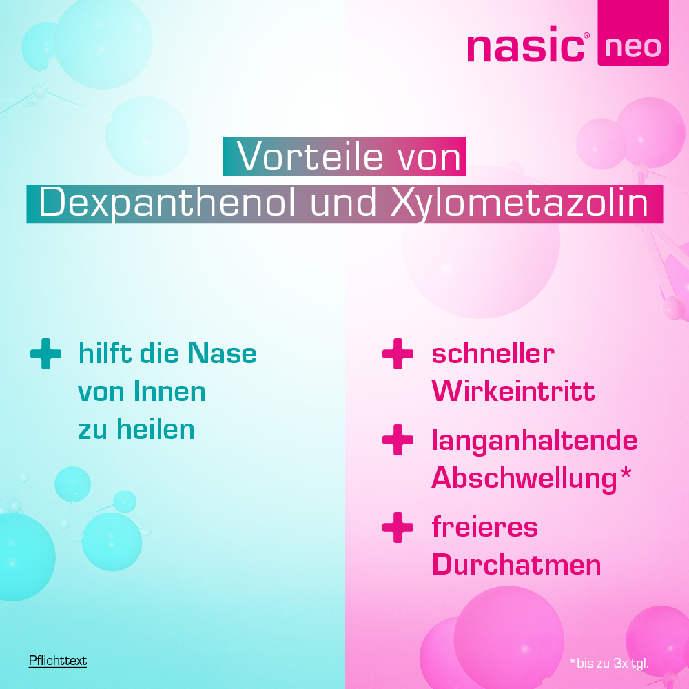 Xylometazolin verengt die Gefäße der Schleimhaut und kann so für eine Abschwellung sorgen. Dexpanthenol pflegt und unterstützt zusätzlich die Heilung der Nasenschleimhaut, die durch Schnäuzen und Austrocknung in Mitleidenschaft gezogen wird. In nasic® neo Nasenspray ergänzen sich die Wirkstoffe und sind zusammen stärker als allein – so können Sie Ihren Schnupfen schneller loswerden!