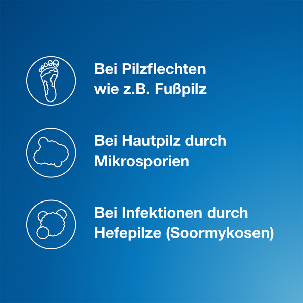 Ohne ärztlichen Rat sollten Sie das Arzneimittel nicht länger als 2 Wochen anwenden, wenn keine Besserung der Beschwerden nach dieser Zeit eingetreten ist. Die Anwendung sollte nach eingetretener Beschwerdefreiheit noch mindestens einige Tage fortgesetzt werden. Die durchschnittliche Behandlungsdauer beträgt: bei Hefepilz-Infektionen 2-3 Wochen, bei Hautpilz-Infektionen 3-4 Wochen, bei Fußpilz 4-6 Wochen.
