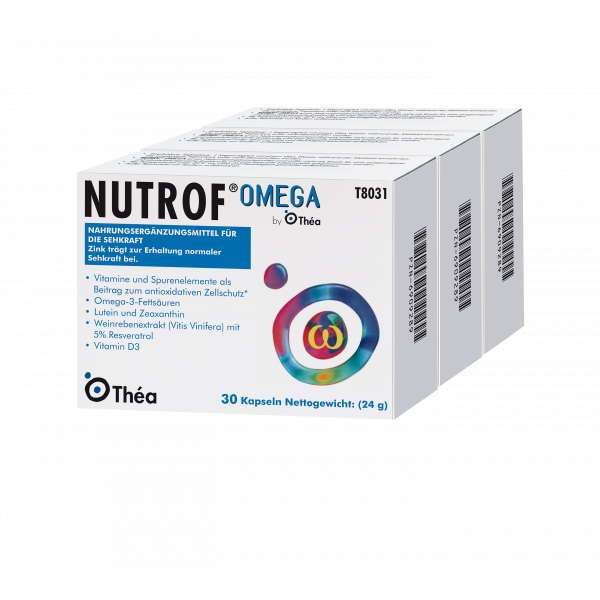 Nutrof Omega ist eine ergänzende bilanzierte Diät zur diätetischen Behandlung der trockenen AMD (Altersbedingten Makuladegeneration).