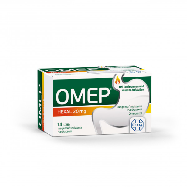 OMEP® HEXAL 20 mg, magensaftresistente Hartkapseln : Wirkstoff: Omeprazol. Anwendungsgeb.: kurzzeitige Behandlung von Refluxbeschwerden (z. B. Sodbrennen, Säurerückfluss) bei Erwachsenen. Enthält