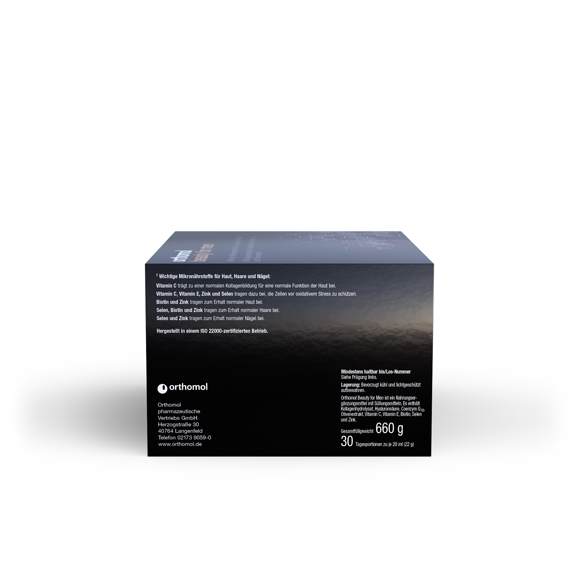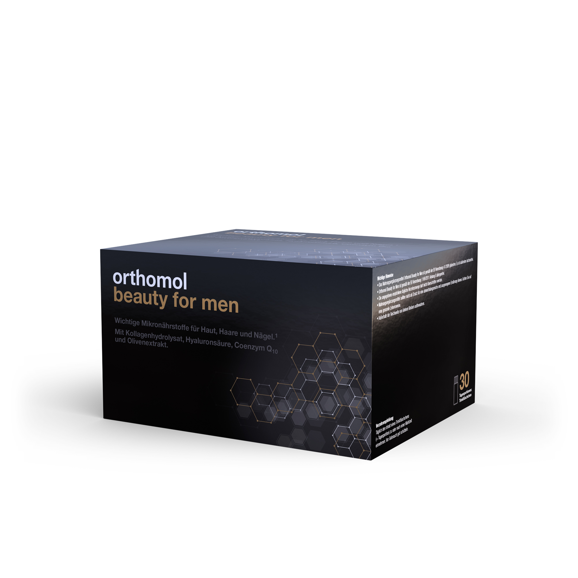 - Orthomol Beauty for Men ist ein Nahrungsergänzungsmittel. Wichtige Mikronährstoffe für Haut, Haare und Nägel. 1 Vitamin C trägt zu einer normalen Kollagenbildung für eine normale Funktion der Haut bei.