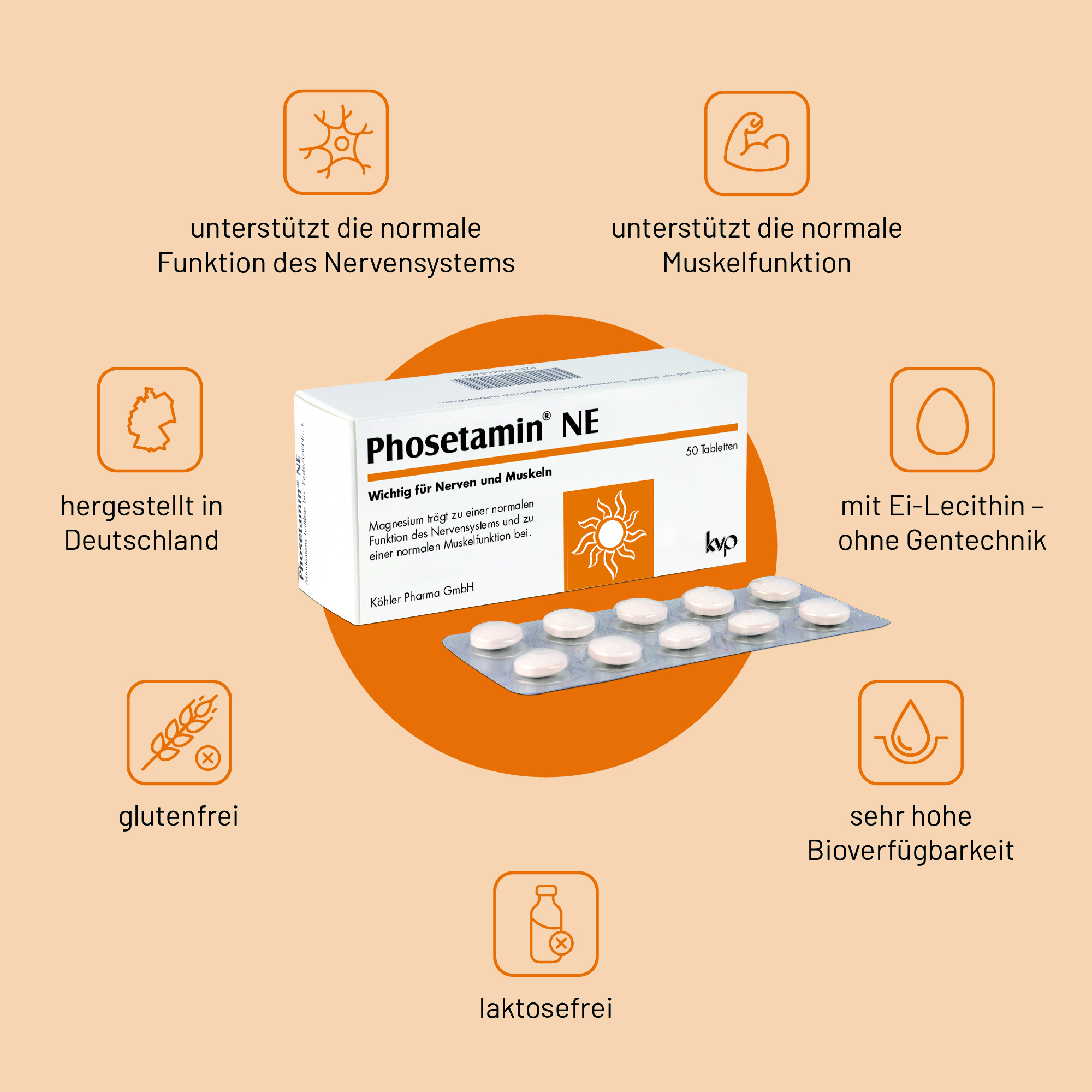 Die Inhaltsstoffe von Phosetamin NE, der speziellen Kombination aus Elektrolyten und Ei-Lecithin, leisten einen effektiven und wertvollen Beitrag zur Gesundheit der Nerven und zu einer gesunden Muskelfunktion.