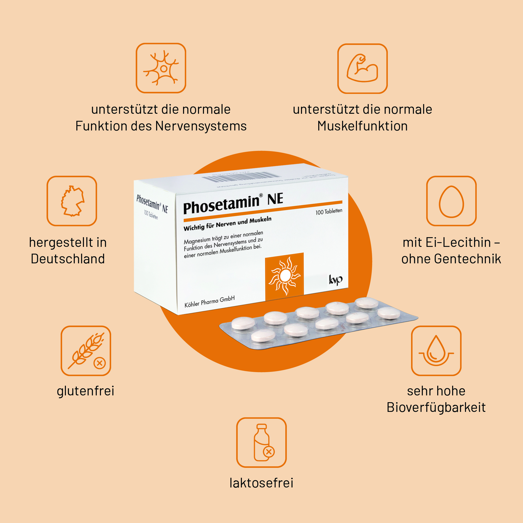 Die Inhaltsstoffe von Phosetamin NE, der speziellen Kombination aus Elektrolyten und Ei-Lecithin, leisten einen effektiven und wertvollen Beitrag zur Gesundheit der Nerven und zu einer gesunden Muskelfunktion.