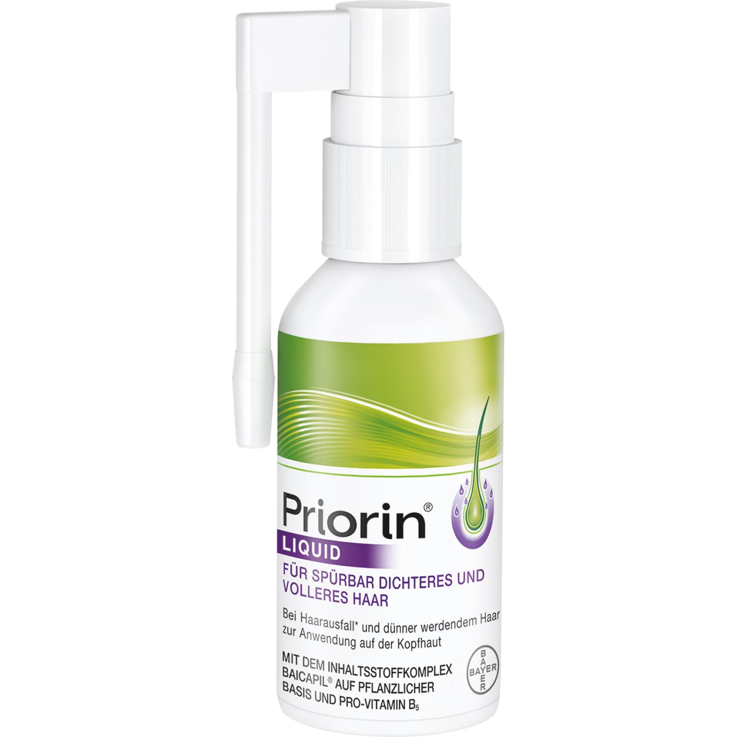Bei Haarausfall* oder dünner werdendem Haar, kann Priorin® Liquid wertvolle Hilfe bieten. Es unterstützt den Haarwachstumszyklus und trägt so zum natürlichen Wachstum der Haare bei – für spürbar dichteres und volleres Haar. Priorin® Liquid enthält den Wirkstoffkomplex Baicapil® auf pflanzlicher Basis (bestehend aus Baikal-Helmkraut-Wurzelextrakt, Soja- und Weizenkeimextrakten) und das hautpflegende Pro-Vitamin B5. Die Anwendung ist ganz einfach: aufsprühen, einmassieren, fertig. Priorin® Liquid riecht angenehm und hinterlässt keine Rückstände, daher kann das Haar nach der Anwendung wie gewohnt frisiert und gestylt werden. Für einen sichtbareren Erfolg nach 12 Wochen**.