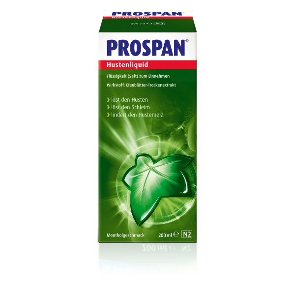 - PROSPAN®. STARK GEGEN HUSTEN: Prospan® Hustenliquid mit der 4-fach Kraft wirkt effektiv bei Husten und Bronchitis. Die Wirkung des einzigartigen Efeu-Spezial-Extraktes EA 575® ist in modernen Studien nachgewiesen1,2,3 und lässt Sie schneller wieder am Leben teilhaben. 4-FACH KRAFT: Schleimlösend – Löst den festsitzenden Schleim in den Bronchien und unterstützt so das Abhusten. Bronchienerweiternd – Durch die entspannende Wirkung auf die Bronchien werden verengte Atemwege erweitert, sodass Sie wieder befreit durchatmen können. Hustenreizlindernd – Lindert den Hustenreiz, um schnell wieder ungestört von Hustenattacken in den Alltag zu finden. Entzündungslindernd – Lindert die Entzündung und lässt die Symptome wieder abklingen.